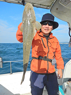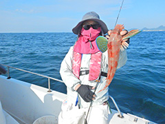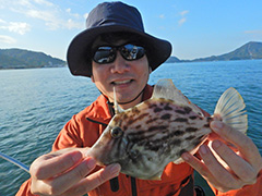 今週は松山沖・船の五目釣りをご紹介します。カワハギをメインにシーズンの魚に挑戦です。2人の釣り人に同行して、まずは高浜沖でカワハギを狙いました。エサは海エビの切り身です。仕掛けは胴付きの3本針です。小型のマダイやフグに邪魔されながらも、ガマンの釣りで海底付近を探り、22〜27pの大型を釣り上げます。ベラ(ギザミ)やホゴ(カサゴ)、トラハゼなどもまじりました。後半は北条沖のポイントで、タイラバ釣りでマダイ狙い。タイラバオモリは60g。ネクタイは、主にオレンジ系を使いました。47〜48pのホウボウを2匹、50pのマゴチを1匹釣り上げました。フィッシング・ストップ間際には、48pの大型マダイもゲット!松山沖の船釣りを存分に楽しみました。
