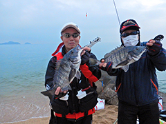 今週は、今治虎ケ鼻海岸で寒チヌに挑戦しました。3人のフカセ釣り師に同行しました。付近の海底は砂地で、所々に藻の密集があります。水深は浅い釣り場です。朝8時釣りスタート。マキエサをまいて、15〜20m沖辺りにポイントをつくります。 当日は、低水温による食い渋りが心配されましたが、釣り開始直後からチヌの活性は高く、40p前後の大型が次々にヒット。気持ち良く竿が曲がりました。食わせエサは、オキアミにも練りエサにもヒットしました。4時間ほどの釣りで、12匹をゲット。冬場のチヌ・フカセ釣りを思いっきり楽しみました。