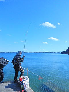 午後1時30分。過去実績のある北浦漁港のスベリで竿を出しました。20mほど沖の海底付近を、ネバリ強く探り続けました。午後2時、スパッ!とウキが沈みました。重々しいパワーが竿を曲げます。慎重に取り込んだのは、45pのチヌ。待ちに待った瞬間でした。取材班、大喜び。寒さと疲れが吹き飛びました!続いて5時前にも、36pの良型をゲットしました。