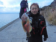 お見事!28.5pの大型カワハギを釣って、ニッコリの釣り人(宇和島市吉田町・大良漁港の波止で)