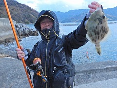 今週は冬場の投げ釣りをご紹介します。低水温下、3人の投げ釣り師がカワハギをメインに狙いました。例年のことですが、愛媛県の場合、冬場は北西の季節風が強く、風裏になる釣り場の選定に苦労します。まずは西予市明浜町・宮野浦の護岸からスタート。青虫や本虫をエサに20p級のカワハギを3匹ゲット。36pの大型イラも釣って、なかなかのスタートダッシュでした。ところが後が続きません。4〜5カ所釣り場を探りましたが、風が強くて釣りになりません。宇和島市吉田町・池の浦の波止で、23pの良型ホゴがヒットしたのみでした。ラストチャンスということで、宇和島市吉田町・大良漁港の波止で竿を出しました。ベラに邪魔されながらも、ガマンの釣りが続きました。釣り終了間際に、青虫エサで28.5pの大型カワハギをゲット。これには取材班大興奮!ドラマチックなフィナーレでした。