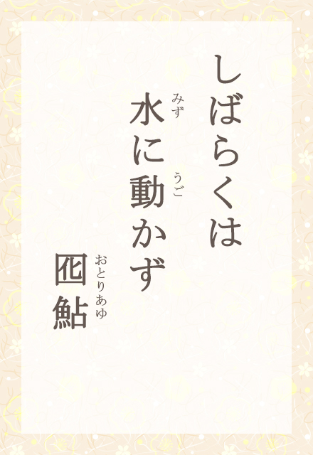 鮎は、またの名を香魚といわれ独特の香りをもつおいしい川魚です。六月に入ると、全国の川で次々に鮎漁が解禁されます。鮎の漁法の中でも最も一般的なのが、鮎の縄張りの習性を生かした友釣り。友釣りに使われるのが「囮鮎」です。釣り師の竿の先に着けられた囮鮎が、まるで獲物を待ち構えるかのように、水の上に静まり返っています。