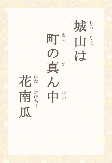 春に種をまいた南瓜は、夏の今ごろ、黄色い花を咲かせます。花が咲けば、次はいよいよ収穫、みのりの予感が満ちてきます。きっと南瓜を植えた畑からも、城山が見えるのでしょう。城山は、町のシンボルとして、人々の生活をふところに抱いています。たくましく暮らしをつなぐ、城下町の活気が伝わる一句です。