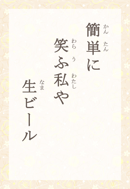 一日を終えた夜、誘い合わせて飲みに行ったのでしょう。もやもやした気持ちを抱えていても、生ビールをぐいっと飲めば、もう笑っている私がいます。自分を客観的に観察したことで、人間という存在について理解が一歩深まりました。憂いを拭う生ビールに、明日への活力を養う夜です。