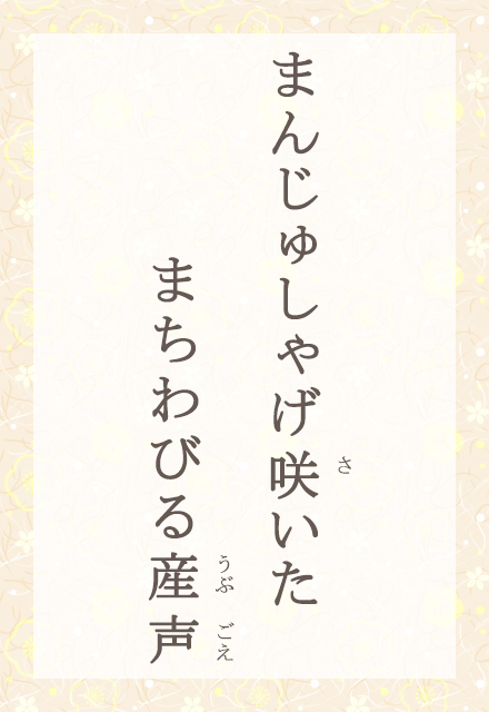 曼珠沙華は、彼岸花や死人花とも呼ばれます。秋のお彼岸のころ、墓地の近くに咲くことなどから、あの世を連想させる花として捉えられてきました。この句では逆に、その曼珠沙華を、生命誕生の産声と取り合わせました。産声を待ちわびる切実な思いに、過去から未来へ、繋がれてゆく命のリレーを思います。