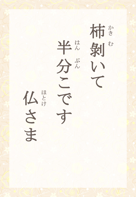赤く熟れた「柿」が山野を彩る季節です。柿は日本の果物の中で最も古くから栽培されてきたもの。古くはすべて渋柿でしたが、鎌倉時代に甘柿が現れたといわれています。今年85歳になられた作者も、柿がお好きなようです。剥いた柿を二つに切って、半分を仏壇にお供えし、半分を味わっています。仏さまに語りかける口語表現が、独特の味わいを醸し出しています。