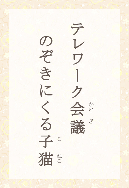 テレワークとは、在宅勤務など、会社から離れた場所で働くことです。オンラインでの会議も、コロナ禍かでずいぶん定着しましたね。自宅から参加する会議の場合、その人の生活が見えることもしばしば。この句では、会議の画面に、飼っている子猫が映り込みました。仕事の緊張がほぐれる、ほほえましい瞬間です。