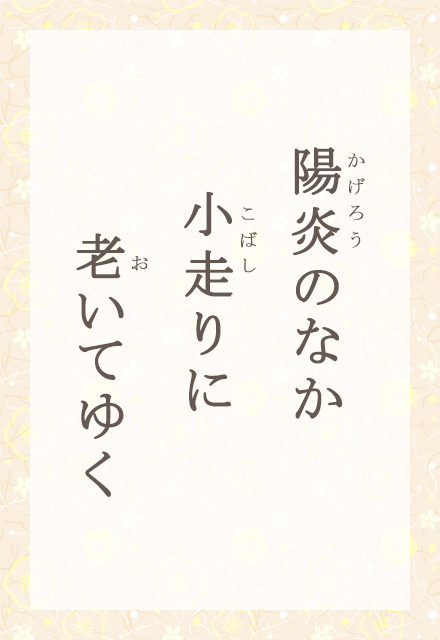 「陽炎」は、春のよく晴れた日に、遠くのものがゆらゆらと揺れて見えることをいいます。気の遠くなるようなうららかな日和です。陽炎に遭遇したときの、不思議な気分を詠んだ句です。陽炎を抜けると、老いた自分がいるのでしょうか。小走りにこわごわと、でも陽炎の向こう側に行ってみたくなります。