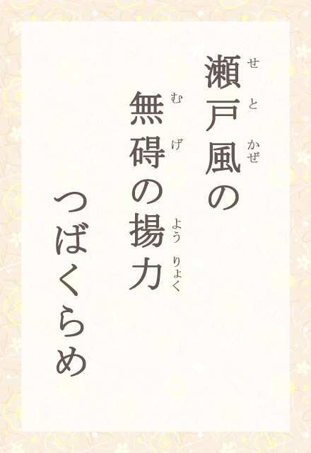 燕は春になると、南国から海を渡り、子育てのために日本へやってきます。ほがらかな青空に燕が飛び交うのを見つけたら、いよいよ春もたけなわです。無碍とは、妨げるもののないこと。瀬戸内海を吹きわたる風は、何にも邪魔されない揚力を生み、燕が飛ぶのを助けます。おだやかな瀬戸内の春を、格調高く詠みあげました。