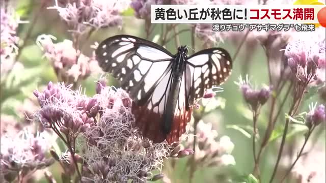 本格的な秋告げる使者・アサギマダラ飛来 伊予市の「黄色い丘」コスモス揺れ秋色に染まる【愛媛】